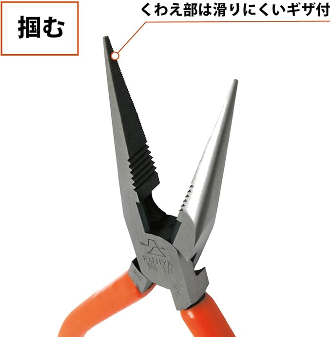 通常のラジオペンチよりも長くかつ先端を細く仕上げている為、奥まった場所での作業に最適です