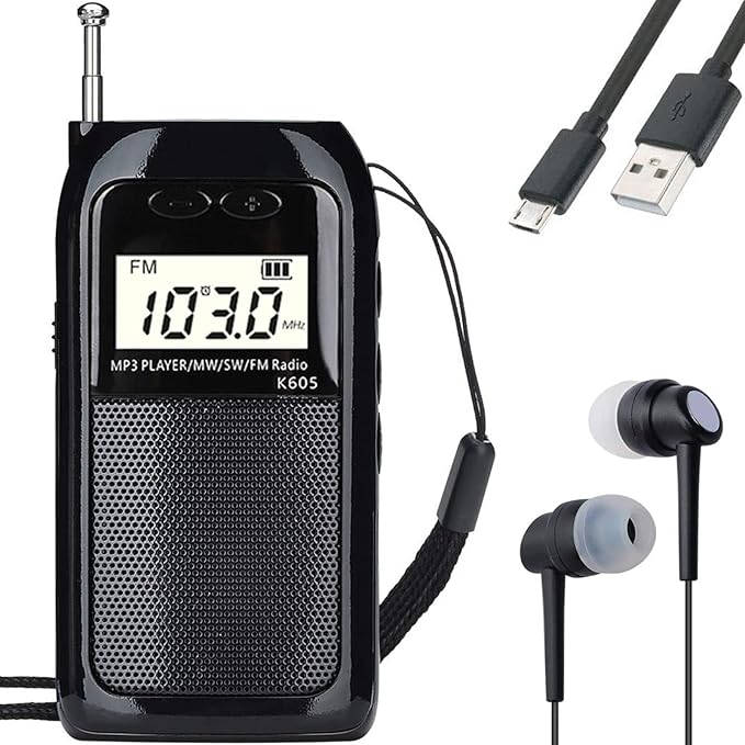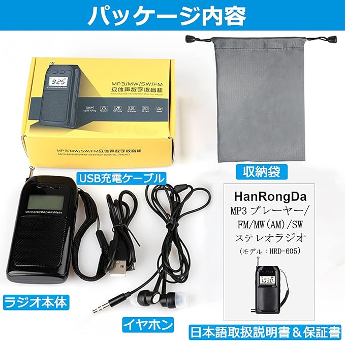 HanRongDa ポケットラジオ 小型 充電式 MP3プレーヤー AM/FM/ワイドFM対応/短波 高感度 90局自動メモリー/デジタル時計/目覚まし時計/スピーカー/TFカード対応 防災 旅行に最適 日本語説明書付属 HRD-605