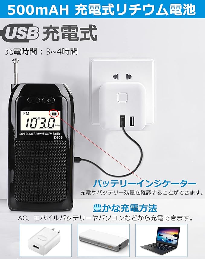【充電式ラジオ】充電式ラジオは500MAHリチウム電池を備えております。USB接続で充電でき、3.5時間の充電でも14時間以上の再生が可能。バッテリーインジケーターを搭載、充電やバッテリー残量を確認することができます。また、ホワイトバックライトは良い色合いで暗い所でも確認容易。