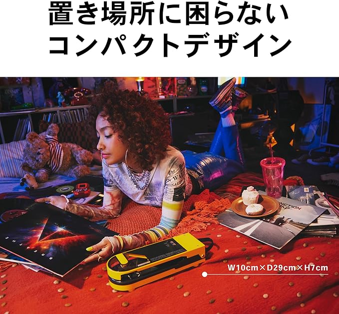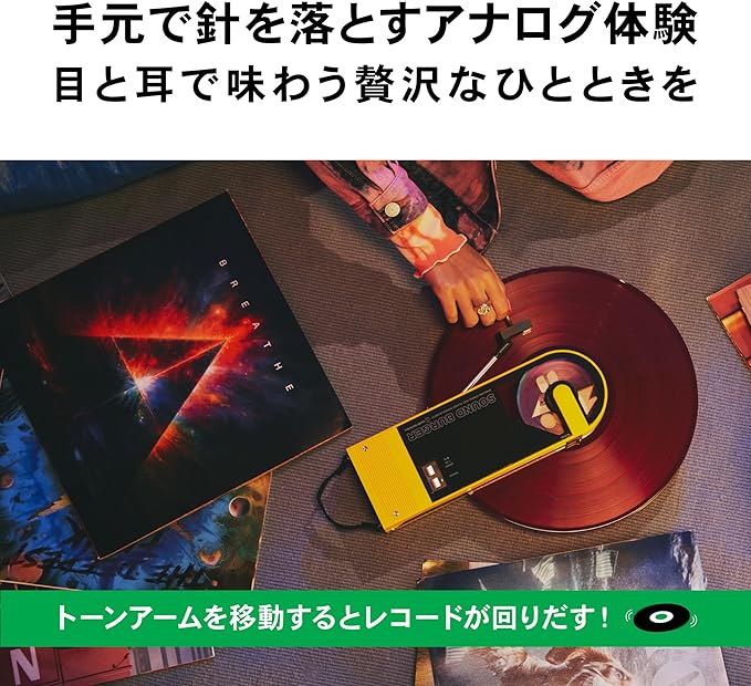 置き場所に困らないコンパクトデザイン誰かに共有したくなる、インテリアに映えるアイテム。レコードを聴き終わった後は、サッとしまえるレトロでコンパクトデザイン据置型レコードプレーヤーをセットするのが難しいという方もご安心ください。リビングラックにレコードジャケットと一緒に飾っておけるコンパクトサイズ(10 35cm)で、奥行きの少ない場所でも置き場所に困りません。さらに、味わいのあるレトロなデザインは独特な存在感を放ち、インテリアに素敵なアクセントを加えます。手元で回るレコードを眺めながら、音楽を楽しむ特別なひとときをお楽しみください。小さいけれど本格的なレコードプレーヤーで回っているレコードを近くで感じ、目と耳で味わう贅沢なひとときを。デジタル配信やサブスクリプションでは感じられない、一口かじればやめられないアナログの世界を、サウンドバーガーとともにお楽しみください。
