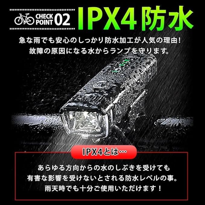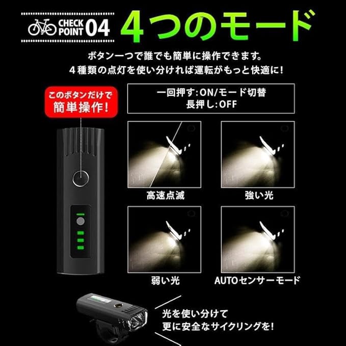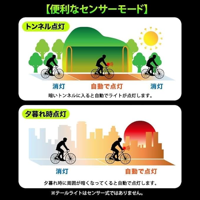 【光センサー自動点灯機能】ボタンで点灯を除く、自動的に点灯・消灯でき、周囲の明るさに合わせ自動でライトの強さを調節する光センサーを搭載しました。夜間走行中に明るい光がくるくる回り、遠くからでも目立つので安全対策に。夕方から夜にかけてやトンネルなどの走行に便利です。