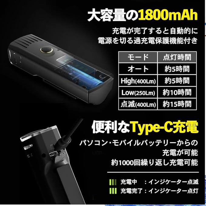 【充電式】3時間で充電完了できます。1回の充電で最大72時間利用可能!スイッチ部に電池残量を知らせる3つインジゲータが搭載ので、充電中と走行中であっても、残り電量、後どのくらいで充電が必要かが判断しやすい。使用時間3-15時間。Type-C充電
