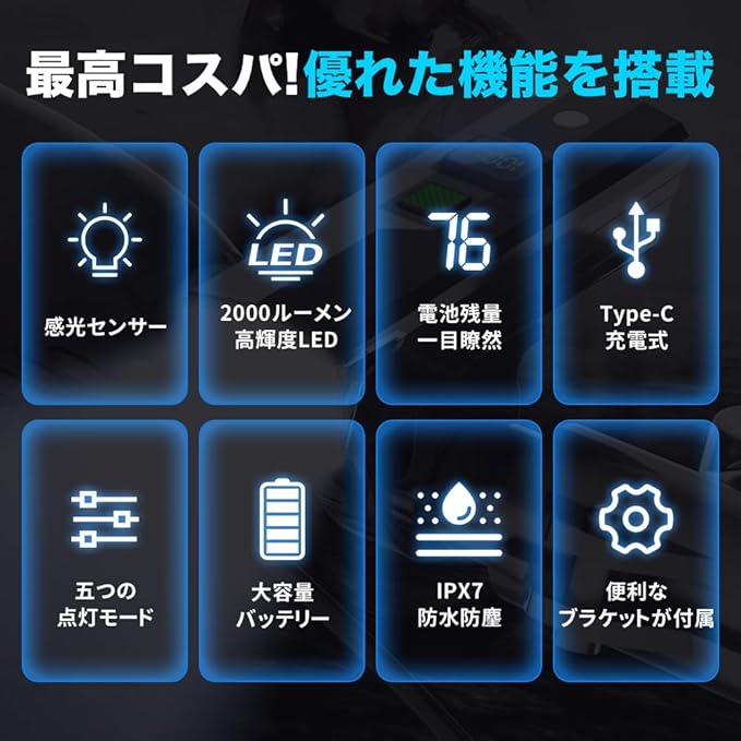 【2025新登場・260m遠距離照射】 自転車 ライト 光センサー 自動点灯 超高輝度 2000ルーメン 小型 IPX7防水 5つ点灯モード 180 大ワイド照明 クロスバイク/ロードバイク/自転車ヘッド ライト TYPE-C充電式 LED残量表示 急速充電 取り付け簡単 小型 明るい 通勤 通学 防振 防災 地震/停電/登山/夜釣り 緊急対応 懐中電灯兼用 日本語説明書付き