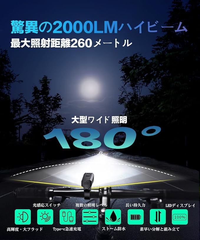 自転車 ライト 【超高輝度・遠距離照射】 光センサー 自動点灯 自転車ライト 高輝度 2000ルーメン 5つ点灯モード 180 大ワイド照明 IPX7防水 自転車ヘッドライト クロスバイク/ロードバイク ライト LED残量表示 TYPE-C USB充電式 取り付け簡単 小型 明るい 通勤 通学 防水 防振 防災 地震/停電/登山/夜釣り 緊急対応 急速充電 懐中電灯兼用 日本語説明書付き