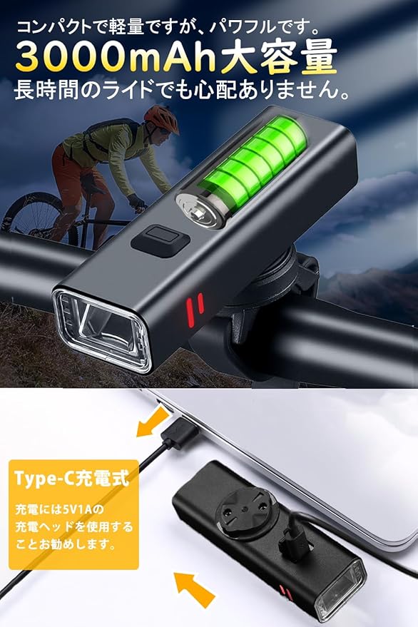 【3000mAh大容量&USB充電式自転車ライト】3000mAhの大容量電池を内蔵しており、接続口はTYPE-Cを採用し、5V1A急速充電を実現します。電池交換不要なので経済的で省エネ。アウトドアや防災に実用的な便利グッズとなります。バッテリー残量表示機能が搭載しているため、突然電量不足で消灯することは防止できます。USB充電式を採用し、夜間通勤や通学におすすめのライトです。