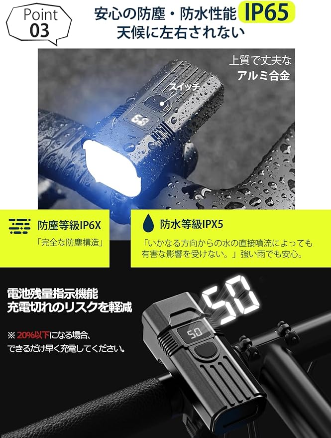 【安心の防塵防水性能IP65 天候に左右されない】上質で丈夫なアルミ合金で、耐久性に優れている ■〈防塵等級IP6X〉「完全な防塵構造」■〈防水等級IPX5〉「いかなる方向からの水の直接噴流によっても有害な影響を受けない」とされているIPX5認証。強い雨でも安心。