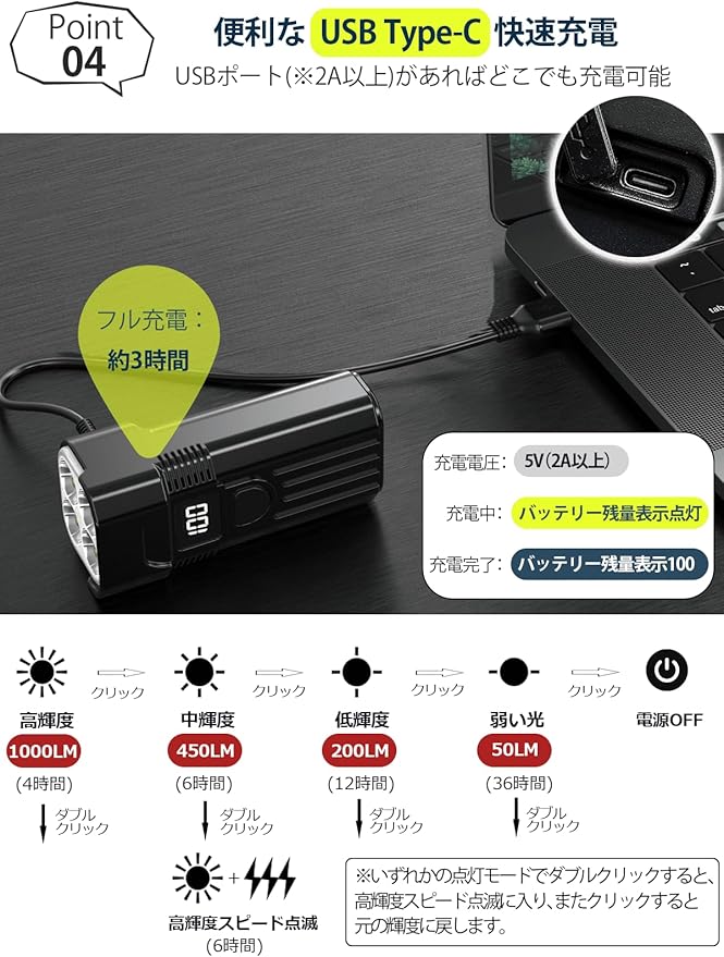 【小型軽量でもしっかり明るい 新型高輝度LED 4つ搭載】■ 1000LM高輝度 200M先まで照明距離、ライダーにとって理想的な視界幅が確保でき、通勤・通学に最適。 ■〈ボタン1つで簡単操作5段階の点灯・点滅モード〉①高 ②中 ③低 ④弱い ⑤高輝度スピード点滅 ■〈メモリー機能〉オンにしたときは前回使用したモードになる。