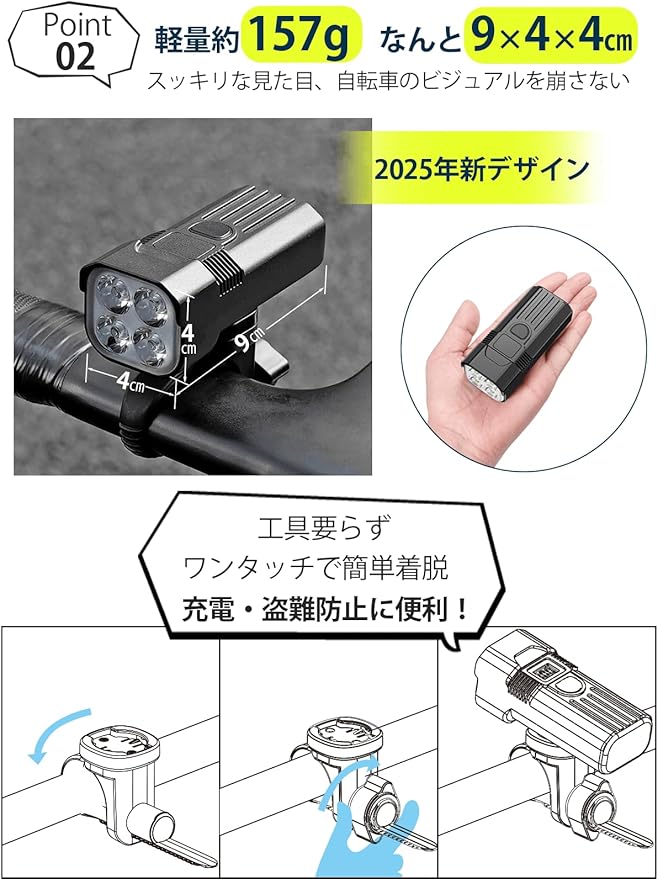 【小型なので装着してもスッキリな見た目、自転車のビジュアルを崩さない】様々なハンドルに対応、工具要らず、ワンタッチで簡単着脱、充電・盗難防止に便利!自転車だけでなく懐中電灯代わりにも。