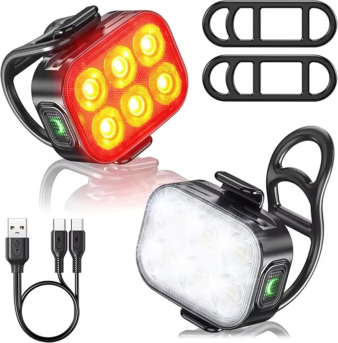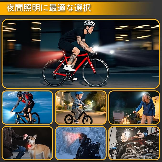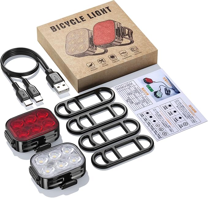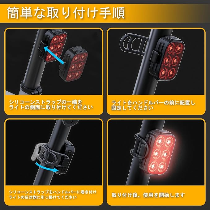 取り付け簡単&多用途:前後の自転車に取り付けるための2対の伸縮性ゴムストラップが付属しており、取り付けが簡単です。この自転車ライトは、サイクリング時の安全ライトとしてだけでなく、ハイキング、キャンプ、釣りなどのアウトドア活動での緊急ライトとしても機能します。さらに、充電式の自転車ライトは、電動スクーター、ベビーカー、バックパックなどにも使用できます。