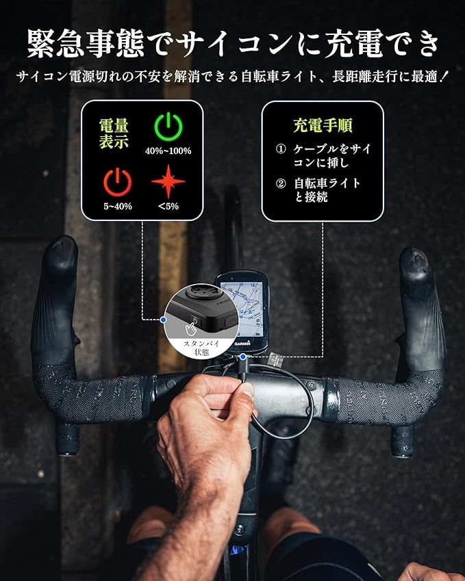 【 36時間連続点灯|緊急充電機能】2000mAh大容量電池で最大36時間の連続点灯が可能にします。Type-Cポートからサイコンの緊急充電機能を搭載して、長距離ライドも安心できます。IPX6防水仕様により、豪雨時のポート腐食保護も万全です。