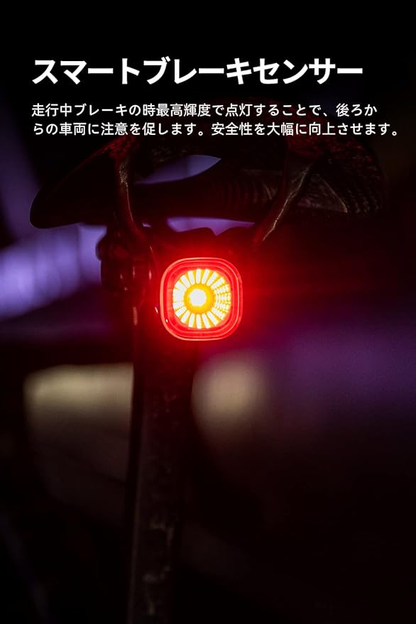 ブレーキ感応:どんなモードでも、振動検知で自転車のブレーキ状態を敏感にキャッチすることができます。内蔵のブレーキセンサーにより、ブレーキを感知すると自動的に最高輝度に点灯します。安全性を大幅に向上させます。