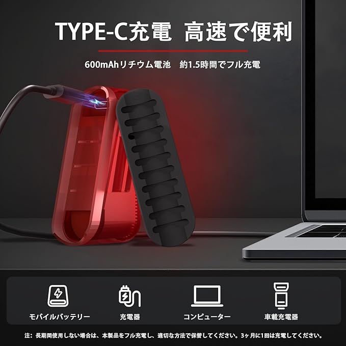 TYPE-C 充電対応、急速充電で利便性向上:当製品はTYPE-C 充電方式を採用しており、充電速度が大幅に向上しています。一般的な充電器と比べ、約 2 時間で満充電を完了することができ、急いで充電する場合でも短時間で使用可能な電力を確保できます。スマホやタブレットなどの充電ケーブルを共用できるため、外出時に充電器をわざわざ持ち歩く必要がなく、非常に便利です。充電口を最適化、耐久性と防水性を高め。充電口は構造を改良して最適化されており、抜き差しがスムーズで長期間使用しても接触不良が起こりにくい設計になっています。また、充電口には特殊な防塵防水キャップを装着しており、充電後にしっかりと閉めることで、水やほこりの侵入を効果的に防ぎ、内部部品を保護します。これにより、充電部分の耐久性が大幅に向上し、長期間安定した充電性能を維持します。長時間持続する電池性能、長距離走行にも対応。優れた省電力技術を搭載しているため、満充電時の持続時間が大幅に延長されています。最も省電力なモードでは最大約 100 時間使用することが可能で、日常の通勤やレジャー走行はもちろん、長距離のツーリングにも十分対応できます。また、電池残量が少なくなるとライトが点滅する警告機能が付いており、充電のタイミングを逃すことがなく、安心して走行を楽しむことができます。