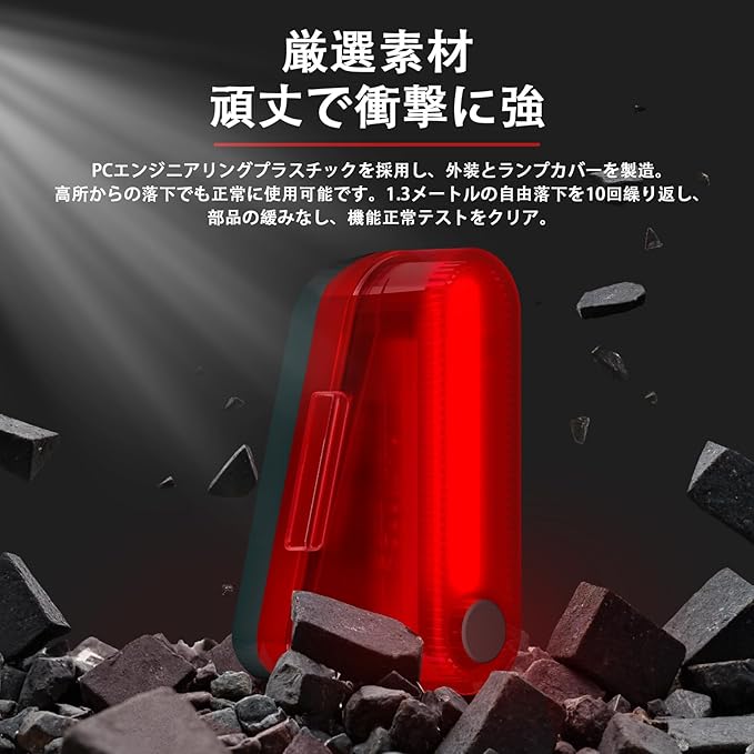 高品質素材を採用、堅牢で耐衝撃性に優れます:当製品のケースとランプシェードは、PC エンジニアリングプラスチックを厳選して製造されています。この素材は優れた強度と耐久性を備えており、日常の使用中に発生する可能性のある衝撃や摩擦に強く、長期間の使用にも耐えられます。高所からの落下にも強く、機能が安定しています。高所から落下した場合でも、正常に機能を発揮することが保証されています。特別に実施したテストでは、1.3 メートルの高さから 10 回自由落下させた場合でも、部品の緩みや損傷は発生せず、点灯機能や点滅モードなどすべての機能が正常に動作することが確認されています。これにより、自転車の取り扱い中に不意に落下した場合でも、安心して使用を継続することができます。厳格な品質管理を実施、信頼性に優れます。製品の開発段階から、厳しい品質基準に基づいて各種テストを実施しています。落下テストだけでなく、温度変化への耐性や防水性能などについても徹底的にチェックを行い、自転車の屋外での使用環境に完全に適応できるように設計されています。そのため、悪天候や過酷な使用条件下でも、安定した性能を発揮し続けます。長寿命設計で経済的にも優れます。高品質な PC エンジニアリングプラスチックを使用することで、製品の寿命が大幅に延長されています。頻繁な交換の必要がないため、長期的に使用すると経済的なメリットも享受できます。また、素材自体が環境に配慮したものであり、使用後の処理も容易です。