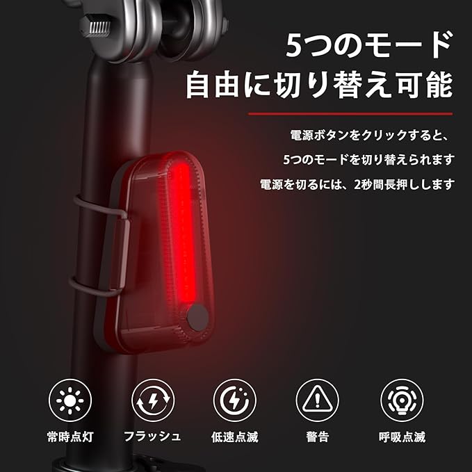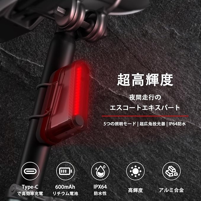 【Amazon.co.jp限定】自転車テールライト 5モード調光 IP64完全防水 高輝度 TYPE-C充電式 環境光センサー 90時間点灯 軽量 昼夜対応 通勤/通学/サイクリング/ハイキング用 安全ライト 夜間走行 アウトドア ロードバイク クロスバイク サイクル 取付け簡単