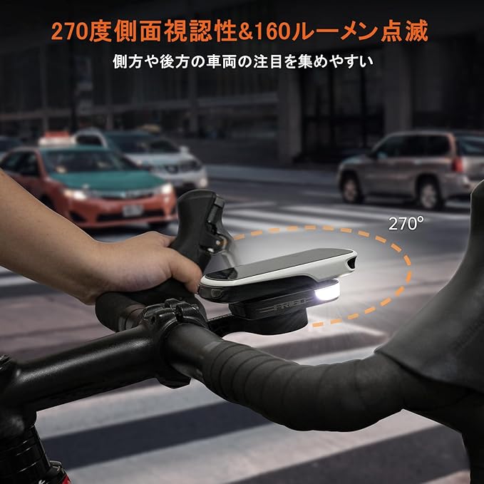 【6つ調光モード・側面視認性】FR160ロードバイクライトは高品質なCOB LEDを採用して、ハイ、ミッド、ロー、警告点滅、急速点滅、ゆっくり点滅合計6つの調光モードがあります。そして、モード記憶機能もあります。再度オンにしたときに最後に使用されたモードを自動設定しています。最大160ルーメンの明るさで作動し、広角レンズが搭載され、側面の視認性も実現し、走行の安全も確保できます。(ご注意:サイコンを見ることを影響しませんため、地面を向けない装着するお願い申し上げます)
