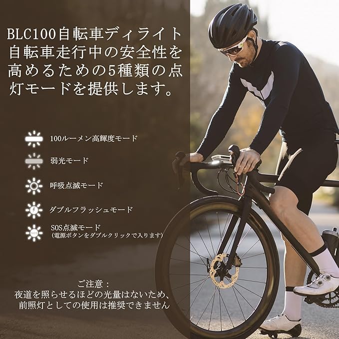 使いやすさを追求:BLC100ロードバイク ライトは、長押しで電源オンになります。ボタンクリックでHighモード、Lowモード、点滅モード、ダブルフラッシュモードを切り替え可能です。ダブルクリックでSOS点滅モードに入ります。長押しで電源オフになります。