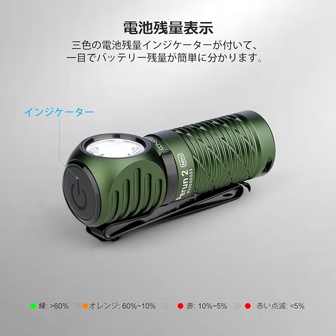 [電池残量表示]Perun 2 Miniはフル充電まで70分間ぐらいかかり、長時間の稼働をサポートしてくれます。更に、残量表示機能もあり、一目でバッテリー残量が簡単に分かります (緑:>60% オレンジ:60%~10% 赤:10%~5% 赤い点滅 :<5%)