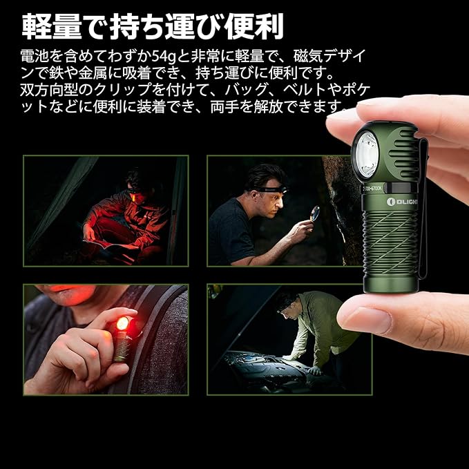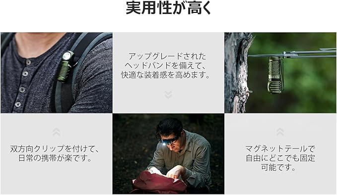 [持ち運び便利&快適なフィット感]バッテリーを含めてわずか54gと軽量に仕上がり、持ち歩きやすいです。また、磁 気デザインを取り入れ、鉄などの金属面に吸着でき、ハンズフリーに作業できます。更に、双方向型のクリップが付いており、バッグ、ベルトやポケットなどに便利に装着でき、両手を解放してくれます。なお、ヘッドバンドは伸縮性と通気性に優れ、長さも調節可能で、快適な装着感を実現します