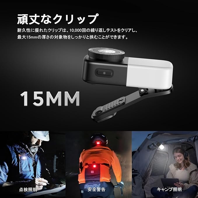 【金属製&IPX5防水】ボディは高品質な金属製で、高級感が漂い、手触りも快適です。1.5メートルから落下しても壊れず、耐衝撃性と耐久性抜群です。IPX5防水仕様で、外出時に雨に濡れても大丈夫です。ただし、水に浸さないでください。クリップは頑丈で、10,000回の繰り返しテストをクリアしており、最大15mmの厚さの対象物に挟み可能です。充実なセット内容:クリップライト*1、Type-Cケーブル*1、テープ付き金属シート*2、ストラップ*1。ご購入後1年間メーカー保証が付いておりますので、ご使用中に何か疑問がございましたら、お気軽に弊店カスタマーサポートまでお問い合わせください。