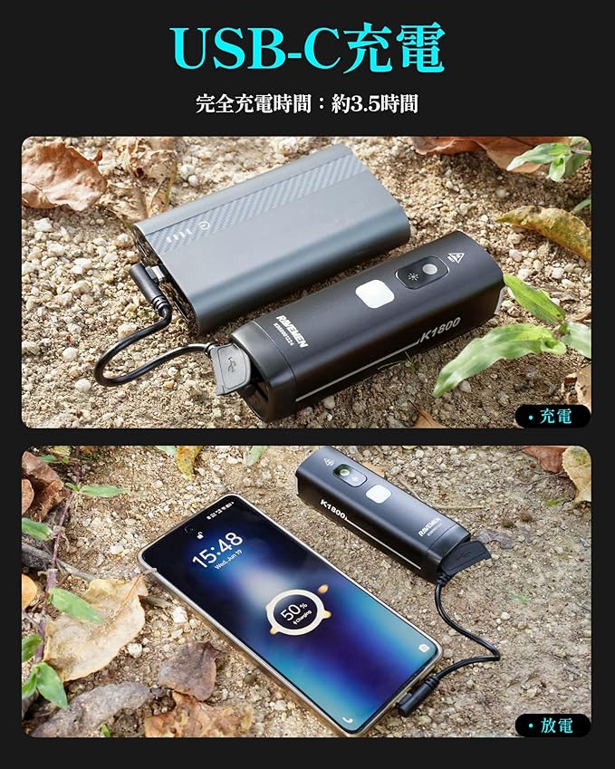 【USB-C充電/放電・電量チェック】K1800自転車ライトはUSB-C充電を採用し、充電しながら点灯できて便利です(満充電:約3.5時間)。放電機能も搭載して、モバイルバッテリとして使えます。スタンバイ状態で、ワンタッチで電池残量を表示でき、突然の電力不足の心配はありません。(緑色点灯:45%-100%;赤色点灯:5%-45%;赤色点滅:5%以下)