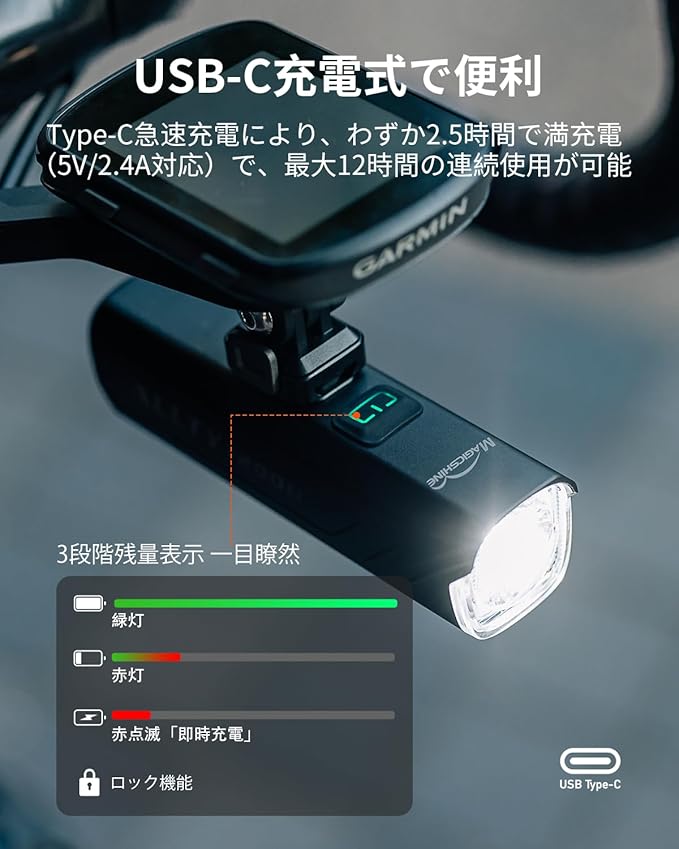 USB-C充電式・知能な電量指示
