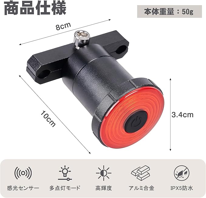 VECELO 自転車 テールライト 防水 充電式 500mAh 100ルーメン 感光センサー重量:50gカラー:ブラック材質:アルミ合金電池容量:3.7V/500mAh明るさ:100ルーメン【カスタマーサービス】お客様の満足度を最優先に考え、弊社は1年間の無料部品交換と30日間の返品ポリシーを提供しています。初期不良がありましたら、いつでもお気軽にご連絡ください(部品の欠損や破損を含む)。