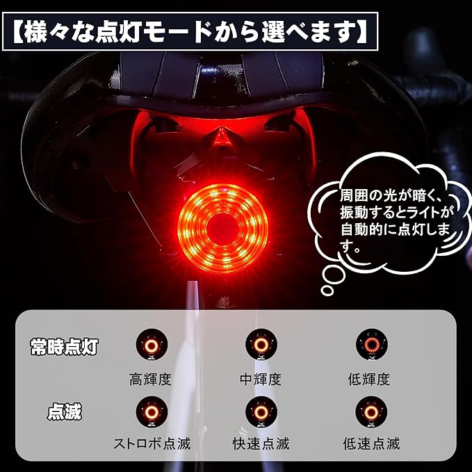 【自動感応】3分以内に自転車が動かない場合、ライトは自動的に消灯します。再び振動を感知すると自動点灯。また、感光センサーがあり、周囲環境が暗くなるとライトが自動的に点灯します。