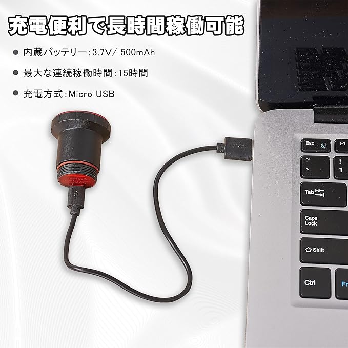 【商品仕様】本体重量:50g;材質:アルミニウム合金;電池容量:3.7V/500mAh;明るさ:100ルーメン;充電方式:Micro-USB