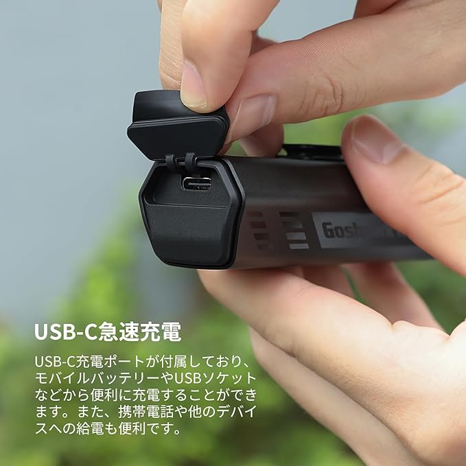 [大容量バッテリー&USB-C充電式] 5000mAh大容量バッテリーを内蔵しており、最大15時間(ロービームローモード)連続でご利用いただけます。便利なUSB-C充電式なので、約2.3時間(5V 3A)で満充電になります