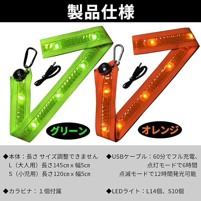 【■仕様】 ●サイズ:長さL145㎝,S120㎝(調節不可)・幅5㎝・LEDライト14個●付属品:USBケーブル・カラビナ●発光時間:点灯モード6時間、点滅モード12時間●USB充電式(60分でフル充電)●保証:通常保証(30日)・メーカー保証(1年間)※商品の管理、品質については万全を期しておりますが、万が一ご注文と異なる商品や不良品がございましたらご連絡ください。