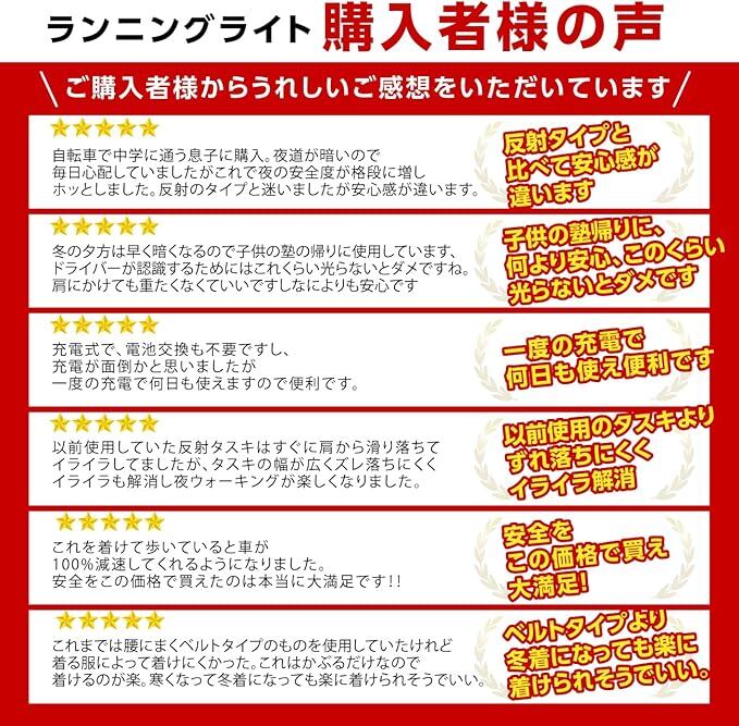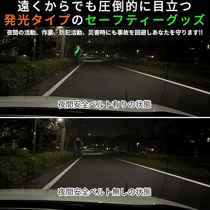 【■"反射+発光"でよく光る】光を反射するだけでなく、ベルト自体が発光する優れもののランニングライト。反射材だけのベルトは、街灯のない場所では見えにくいことも。発光式のベルトは真っ暗な場所でもちゃんと光るから、360度よく見えます。反射ベルト・反射シールよりも視認性がよく、目立って安全。