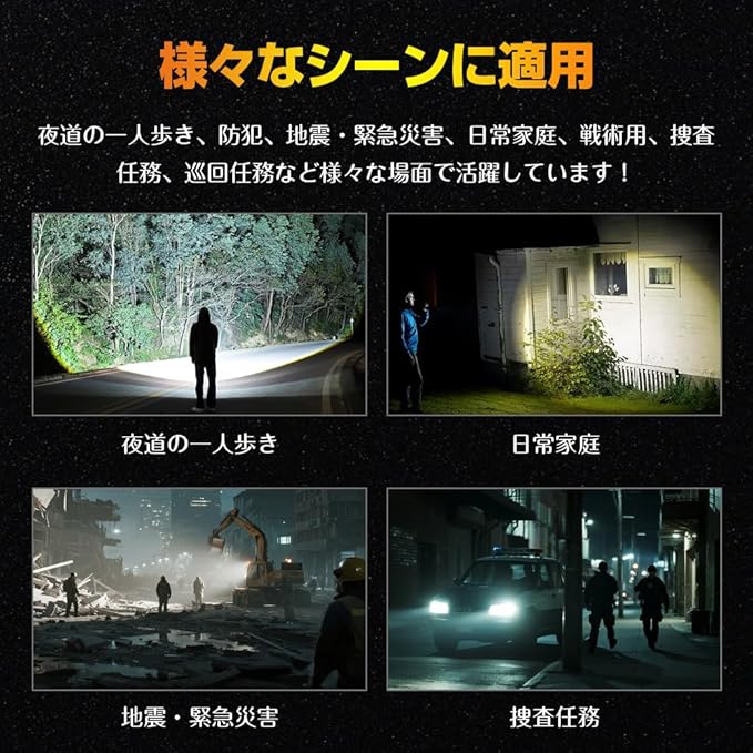 【フォーカス調整機能&耐久性・高品質IP56防水防塵】懐中電灯のヘッド部分はを回して、ズーム機能が可能です。光束を広くから狭くして、最大500メートル遠くの物体に焦点を合わせます。拡大して180度広い物体領域を照らすこともできます。軍用超高硬度のアルミ合金を採用され、本体頑丈で耐衝撃性に優れ、防災や自衛などに使用可能です。日常生活の雨水などによる水滴の付着や飛沫程度なら、懐中電灯本体に悪影響なく耐えることができます。(水に浸さないでください)。アウトドア・キャンプ・登山・防犯・防災・地震対策・停電時などに大活躍しています。