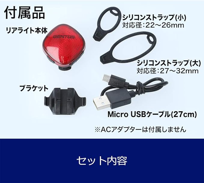 セット内容・付属品:本体、Micro USBケーブル (27cm)、ブラケット、シリコンストラップ (大) (対応径 : 27~32mm)、シリコンストラップ (小) (対応径 : 22~26mm)、専用充電池 (内蔵)
