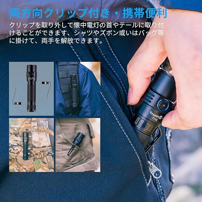 【高品質素材・IPX8防水・両方向クリップ】TrustFire T11R懐中電灯は、長さ123mm、直径27mm、正味重量69.7g(18650バッテリーを除く)のコンパクトなサイズです。航空機級6061アルミ合金使用する、軍用Ⅲ型硬質陽極酸化/耐磨耗処理、1mの高さからの落下に耐える耐衝撃性も持っています。また、IPX8防水規格に達し、複雑で変化する屋外環境で使用することができます。ステンレス製の二重方向グリップが備えて、バッグ、ベルトやポケットなどに便利に装着でき、両手を解放できます。