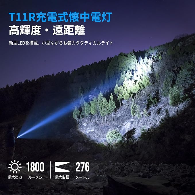 【コンパクトなパワフル懐中電灯】LUMINUS SST-40 LEDチップ搭載、最大輝度1800ルーメン、最大照射距離276メートルに達します。18650バッテリー付きから最大28日間の実行時間、T11Rは旅行中や長期間のアウトドアでの使用にも適しており、防災、停電、緊急時、作業などの必需品としてお勧めです。
