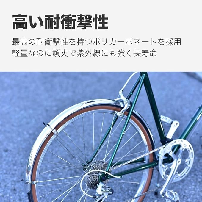 フェンダー本体はプラスチックの中で最高の耐衝撃性を持つポリカーボネートを使用。頑丈で紫外線にも強く、長寿命。