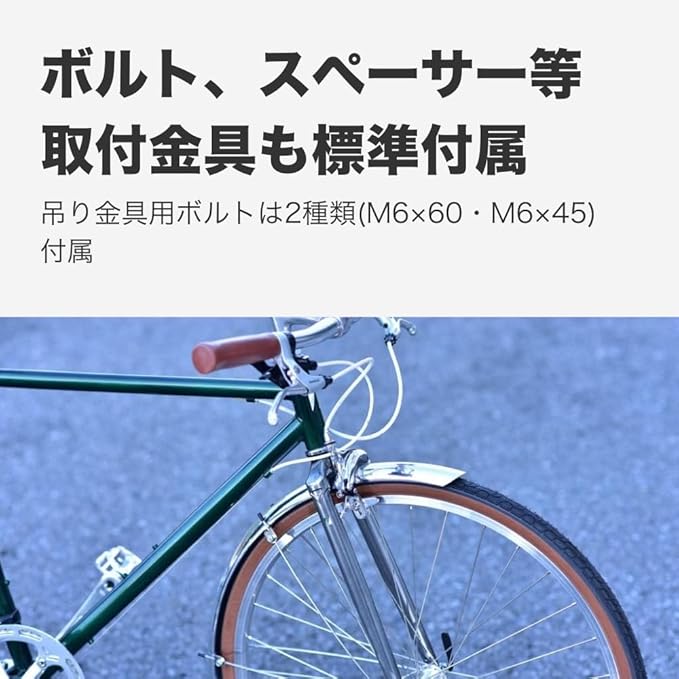 吊り金具をステンレスパーツにしているので、キャリパーブレーキのクロスバイクやロードバイクでも取り付け可能。