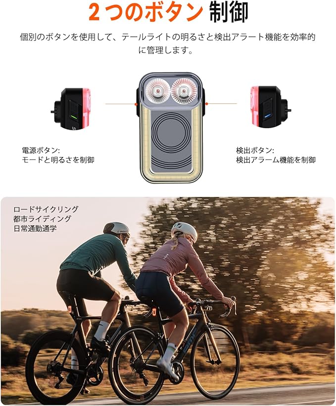 【100 ルーメン・レーダー自動検出保護】25m先の接近車両を自動検知! 危険を察知すると強力点滅で警告し、サイクリングの安全性を革新します。