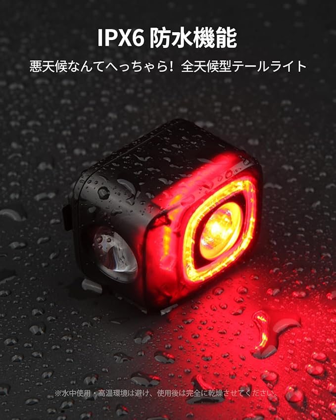 【IPX6防水】自転車リアライトはIPX6防水基準をクリア。豪雨や水しぶきにも強く、あらゆる悪天候下でも視界を確保し、道路をしっかり照らします。