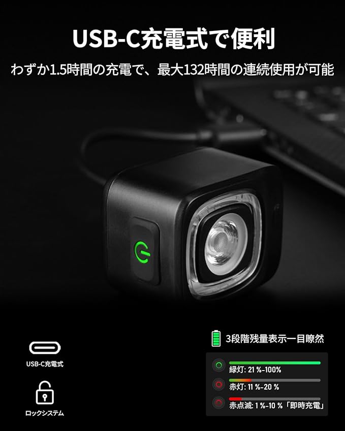 【USB-C充電式・電量表示機能付き】大容量バッテリー搭載で、USB-Cケーブルによるフル充電は1.5時間。最大50時間連続使用可能。電源ボタンを素早く押すと残量表示が可能。5秒間長押しでブレーキセンサー機能のON/OFFを切り替えられます。(※バッテリー残量<5%で赤点滅しますので、すぐに充電してください。)