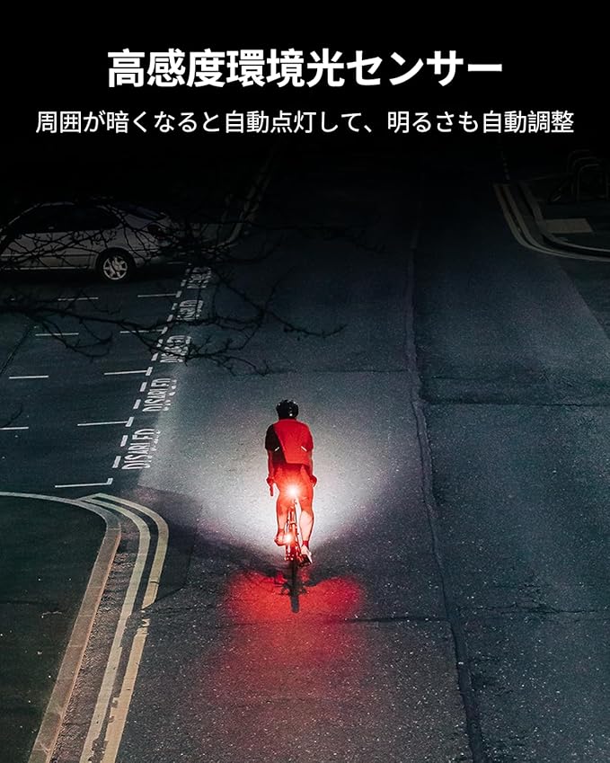 【自動消灯/点灯・ブレーキ警告機能】高感度インテリジェントセンサーチップ搭載。センサーがブレーキの動き(G)を検知すると、約3秒間200ルーメンの最大輝度で自動点灯し、後続車に減速を警告。昼夜を問わず、すべての点灯モードで対応可能です。(※ブレーキセンサー作動時は、連続動作時間が大幅に短縮されます。)