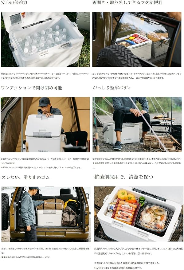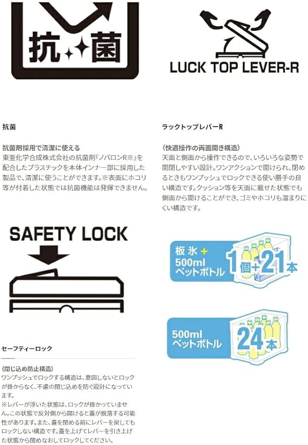 機能および付属パーツ:ICE値(h) 40 / 断熱構造 発泡ポリスチレン / 抗菌(ボディーインナー) / 取り外し可能フタ / 両面開き / ラックトップレバー / セーフティロック(閉じ込め防止構造) / ハンドル / 水栓 / ワンアクション水栓 / 滑り止めゴム
