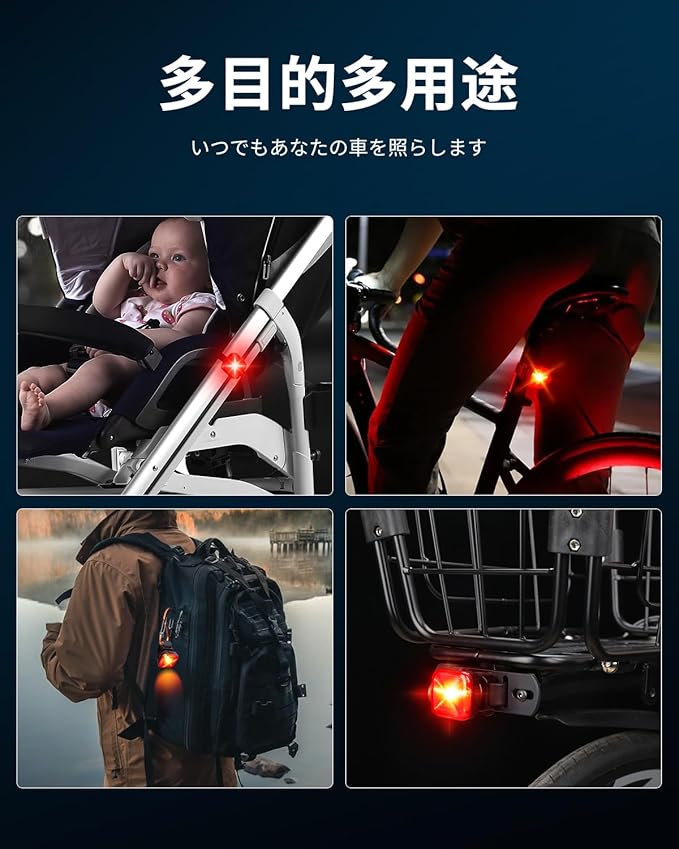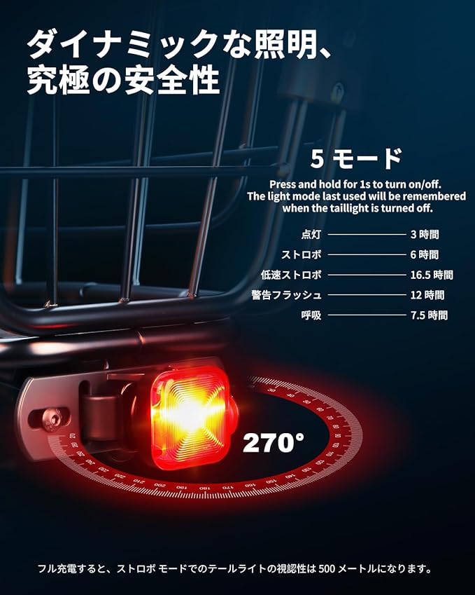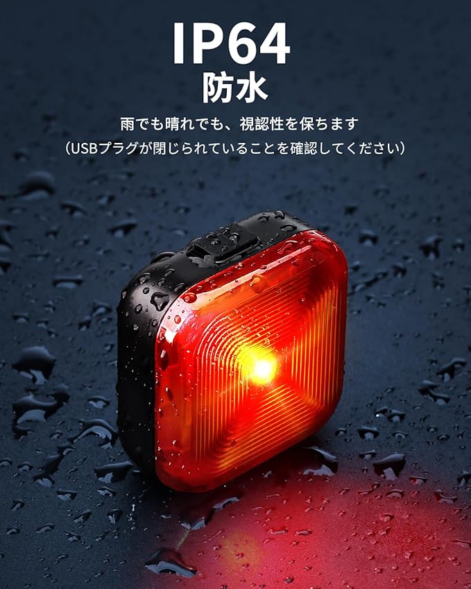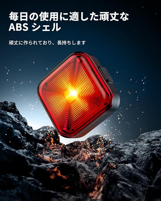 【5モード切替で多様なニーズに対応】常時点灯から呼吸灯効果まで、5種類の点灯パターンを搭載。暗い路地での走行から停止合図まで、あらゆるシチュエーションで効果的な視認性を確保。ボタン一つで簡単にモード切替可能です。