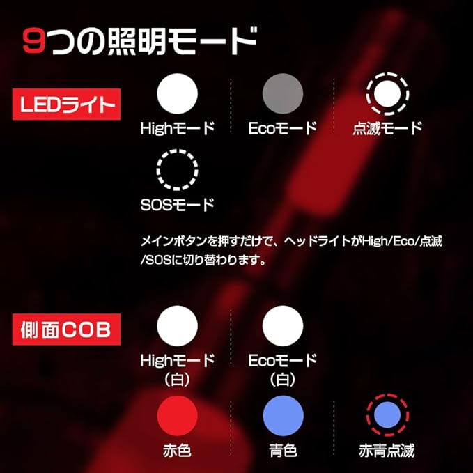 【9モード調光】メインスイッチを押すと高輝度-中輝度-点滅-SOS-OFFの4つのヘッドライトモードを切り替えます。COB作業灯を長押すと白ランプの高輝度-COB白ランプの低輝度-OFF&COB赤信号-COB青信号-COB赤青点滅-OFFの5つの照明モードがオンになり、各種の暗い環境に簡単に対応できます。