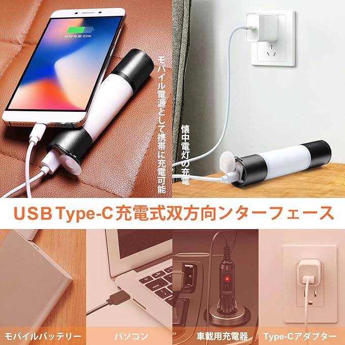 【Type-C充電式双方向& アウトドア用ライト】2600mAh充電式のリチウムバッテリーが内臓、付属のType-Cケーブルで直接に充電することができます。ユニークな充電デザイン、USBポートを水埃から守ります。緊急の場合モバイル電源としても使用できます、 は携帯電話や他の電子機器の充電ができます。