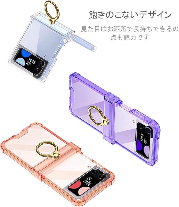「透明性抜群」上質でハードなポリカーボネート素材を採用し、特殊加工により高い透明度を実現、スマホ本体の美しさをそのまま楽しめるクリアケース。まるで裸のZFlip4を持ってるような感じです。また変色変形しにくくなっています。