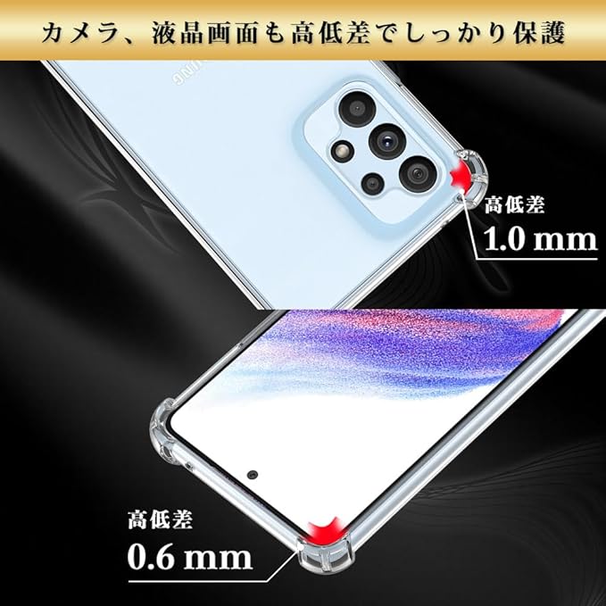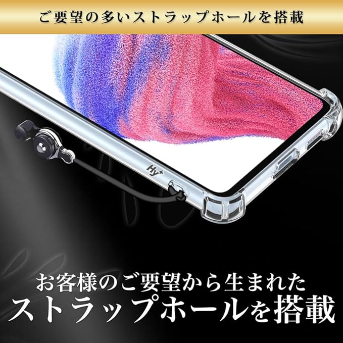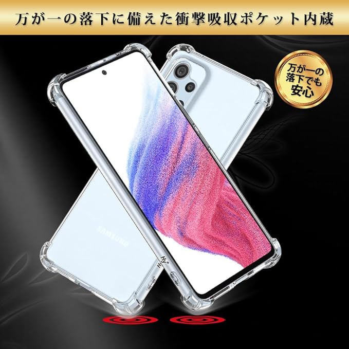 【スマホを落としてしまっても衝撃を最小限に抑えるケース】スマホが日常の生活に溶け込む現代で、落下などによるスマホの破損は販売台数に比例して増えている状況です。本ケースの角には落下時の衝撃を吸収するエアポケットを備えており、万が一スマホを落としてしまった場合でも、落下時のダメージを最小限に抑えることが可能となっており、その耐衝撃性能は第三者機関の試験による米軍MIL規格をクリアするほど高いことが証明されております。また、Galaxy A53 SC-53C SCG15専用にオリジナル設計しているためぴったりとフィットし、保護性能には欠かせないポイントとなっています。