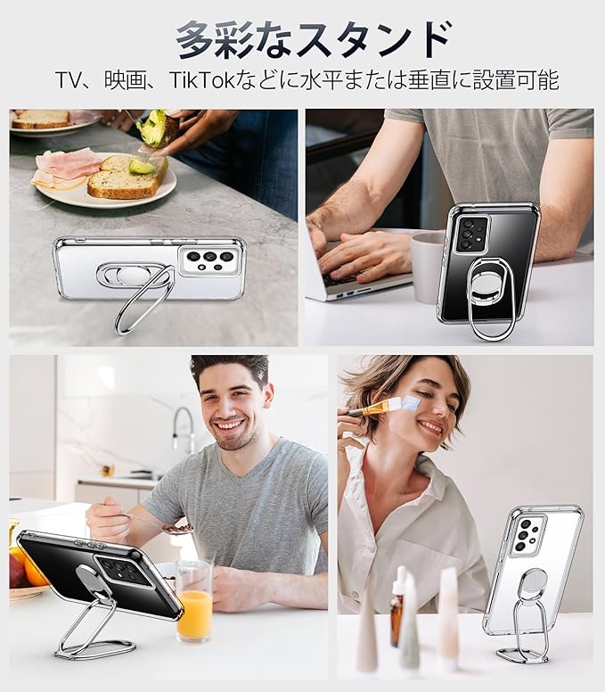 【自由に回転するリングスタンド】 このGalaxy A52 5Gのケースには、360 回転するベースと、それぞれ最大180 および350 まで調節可能な2つのアームが搭載されています。多彩なハンズフリー視聴オプションを提供します。