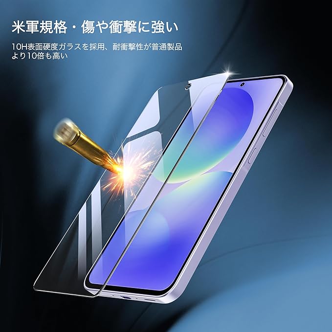 【10H硬度・ケースと干渉しない】10H表面硬度ガラスを採用。スマートフォンがカバンの中で鍵などの鋭いものにぶつかっても傷が付きにくく、Galaxy A36の画面をしっかり保護します。本体の縁まで適度なスペースを残すデザインで、フィルムの剥がれや浮き上がりを防止。ほとんどのケースと干渉しない設計で、常に美しい画面を楽しめます。