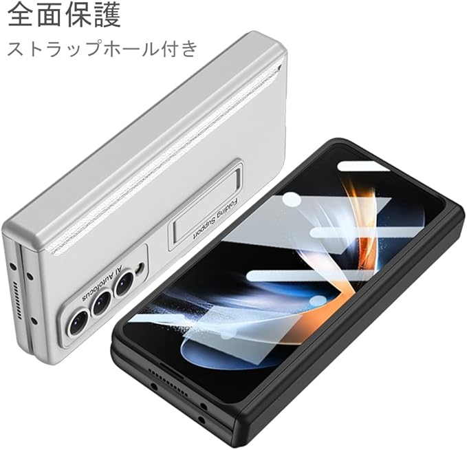 Galaxy Z Fold4 ケース ガラスフィルム付き Samsung ギャラクシーZ フォールド4 5G 用 カバー Uovon スマホケース 薄型 ヒンジ保護 軽量 スタンド付き 全面保護 カメラレンズ保護 おしゃれ 人気 ストラップ穴付き ・ ブラック